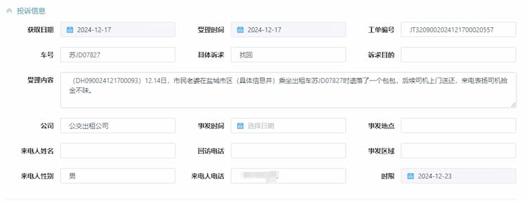 12月17日,出租汽車公司收到市民趙先生撥打12345政務(wù)熱線表?yè)P(yáng)工單,感謝的姐袁海香拾金不昧、樂(lè)于助人。