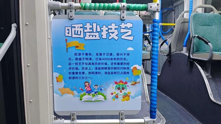 除了安全保障、服務(wù)提升,市公交公司還在校園定制專線上融入了鹽城地方特色文化元素,打造了獨具特色的“非遺文化車廂”。走進(jìn)車廂,映入眼簾的是充滿年味的蛇年主題裝飾,拉手環(huán)上印著“靈蛇獻(xiàn)瑞”、“筆走龍蛇”等寓意好的成語,車輛上方的宣傳欄及車輛擋板上則展示了“曬鹽技藝”“彩繪葫蘆”“岡西剪紙”等鹽城豐富的非物質(zhì)文化遺產(chǎn)及蛇的寓意簡介,讓學(xué)生們在乘車途中,就能感受到濃厚的文化氛圍。