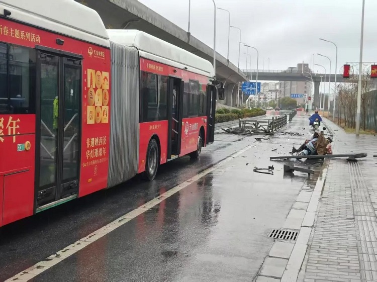 事情發(fā)生在3月3日下午15:35分左右,孫海雷駕駛B1線公交車從潮聲路停車場發(fā)車,行駛至黃海路范公路北側(cè)時,突然聽到“嘭”的一聲巨響。他循聲望去,發(fā)現(xiàn)一輛小型SUV汽車撞倒了路邊的護(hù)欄,護(hù)欄直接砸向了一輛正常行駛的電動車,電動車駕駛員當(dāng)場受傷倒地。
