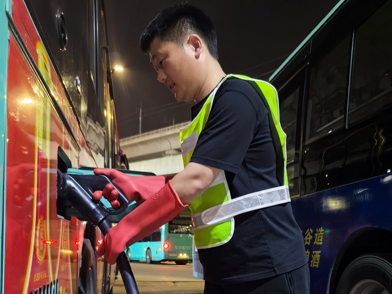 白天,他們精心維護(hù)充電樁區(qū)域衛(wèi)生,細(xì)致巡查充電設(shè)備,積極協(xié)助駕駛員高效完成補(bǔ)電任務(wù);夜晚,他們爭(zhēng)分奪秒,為“饑腸轆轆”的公交車逐一充滿電,確保它們“滿血復(fù)活”,以最佳狀態(tài)迎接次日的運(yùn)營挑戰(zhàn)。華健物流園公交樞紐的充電工張浩,便是其中之一。