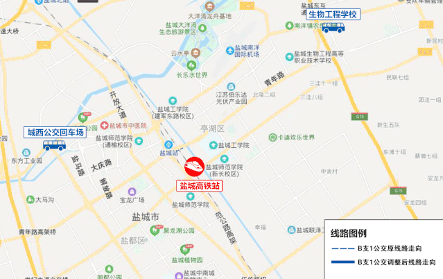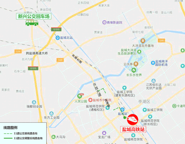 線路走向:高新區(qū)公交樞紐、振興路、鹽瀆路、新204國道、新都路、良友路、鹽瀆路、新園路、世紀大道、范公路、鹽城高鐵站