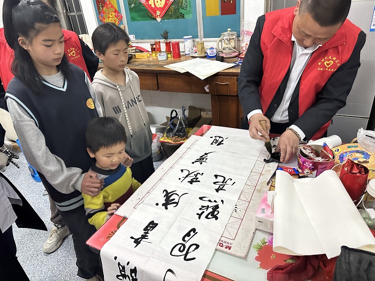 “點(diǎn)如水滴由輕到重;橫似扁擔(dān)兩頭稍頓……”志愿者朱茂同師傅手把手地指導(dǎo)孩子們練習(xí)毛筆字,從坐姿、握筆、選貼教起,為孩子們講解毛筆書法的入門知識(shí)。